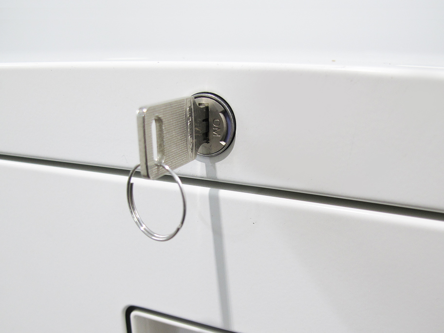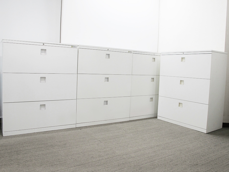 【送料無料 東京地区限定】【美品】4台セット 鍵付き書庫 ホワイト色 天板付き ラテラル書庫 3段 スチールキャビネット 保管庫 収納棚 オカムラ 岡村製作所 レクトライン 国産