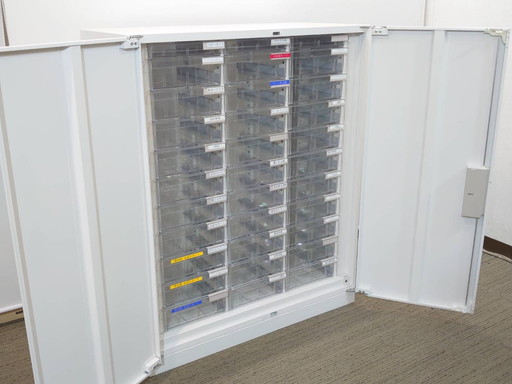 【送料無料 東京地区限定】レターケース 扉付プラスチックキャビネット A4 3列11段 浅型 深型 コンビ型 書類ケース 整理ケース トレーキャビネット 書類整理庫 キャビネット 保管庫 両開き書庫 両開き扉 スチール書庫【中古オフィス家具】【中古】