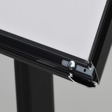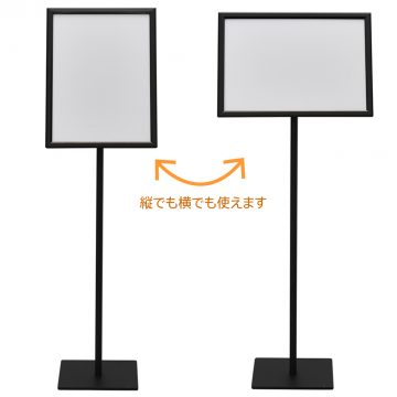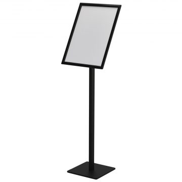 スナップ式アルミフレームのスナップ案内板A3ブラック。フロントオープンで簡単に中身の入れ替えができます。ボード面はタテ位置でもヨコ位置でもどちらでも使えます。ボード面の角度は約60°で固定です。表面保護用の透明カバーが付いています。