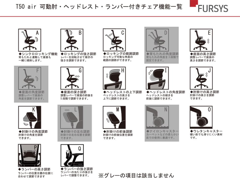 * 備考 エアスキンメッシュは、FURSYS社が独自に研究開発したメッシュ素材。デュポン社のハイトレル®素材を使用した強靭な弾性糸で構成されており、優れた伸縮性と弾力性を持っています。さらに、柔らかいマイクロファイバーと丈夫なナイロン糸を一緒に編成することで、より長く快適な座り心地を実現しています。