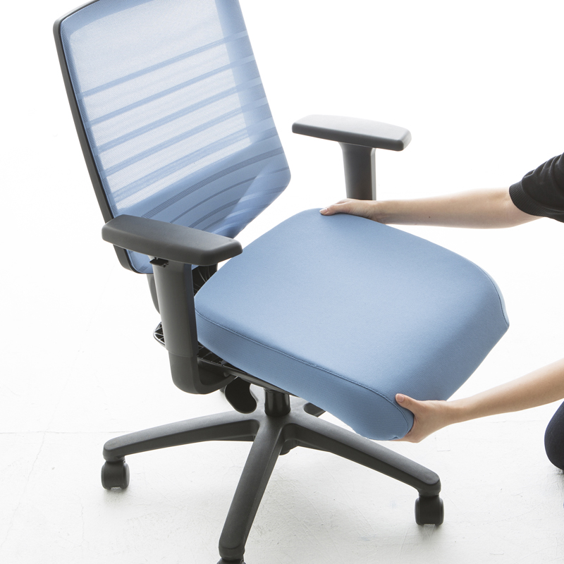 T30シリーズのベーシックなオフィスチェア。背もたれは密度に変化をつけたグラデーションメッシュで体圧に合わせて背中をしっかりと支えます。座面は厚みのあるクッションで座り心地抜群、マジックテープで簡単に脱着でき、カバーを取り外して洗えます。背座シンクロロッキング機構、背角度固定機能あり。洗い替え用に便利な別売シートカバー(FHTN302RF012)も取り扱っております。