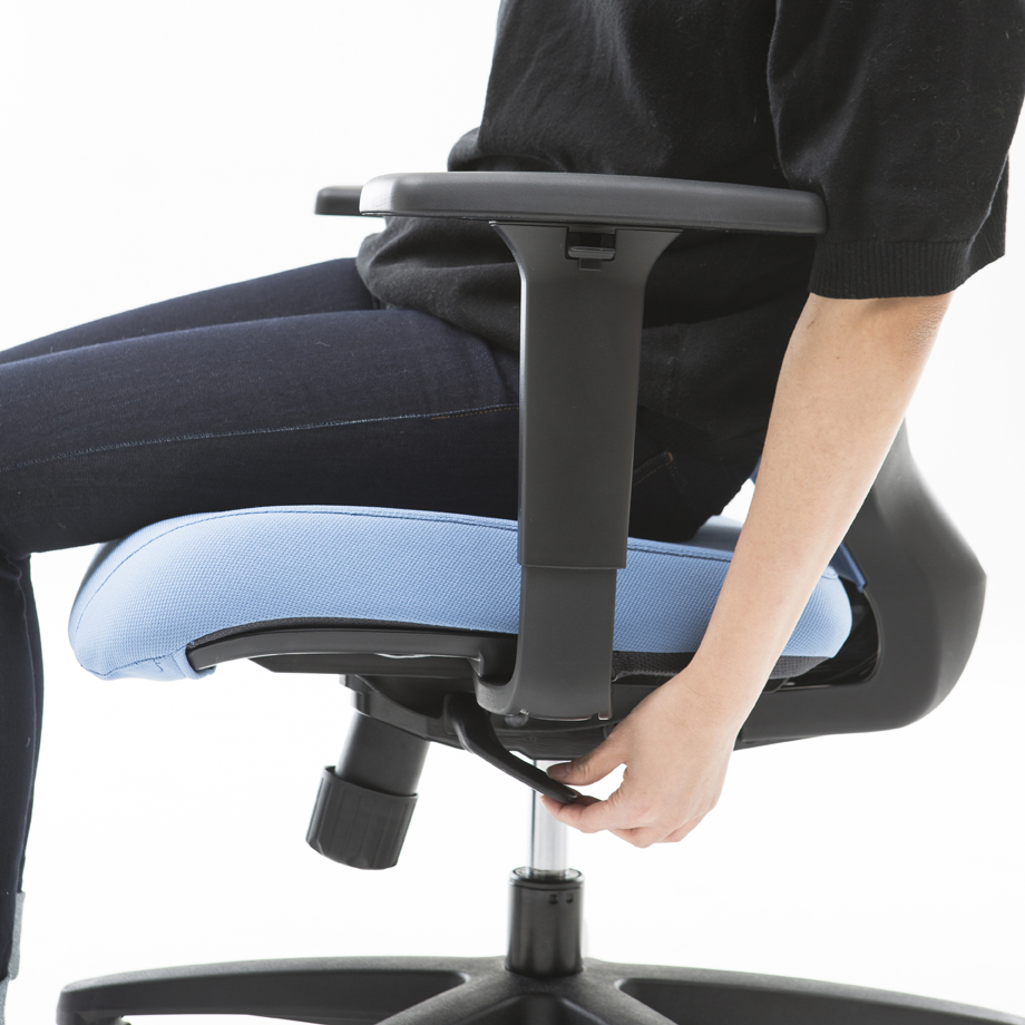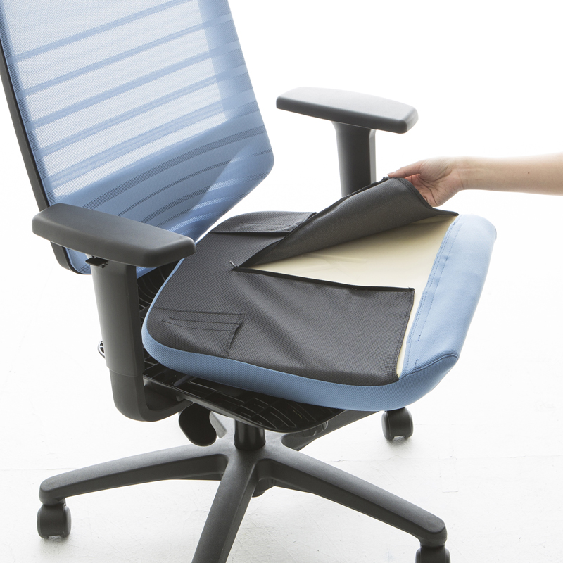 T30シリーズの可動肘とヘッドレスト付きオフィスチェア。頭部にもサポートがあることで首や肩の負担を軽減、背もたれは密度に変化をつけたグラデーションメッシュで体圧に合わせて背中をしっかりと支えます。座面は厚みのあるクッションで座り心地抜群、マジックテープで簡単に脱着でき、シートカバーを取り外して洗えます。可動肘は5段階90mm内で高さ調整、4段階20mm内で左右調整が可能です。背座シンクロロッキング機構、背角度固定機能あり。ヘッドレストもS字カーブでフィットします。