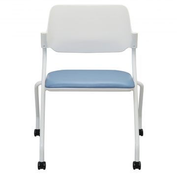 滑らかなシルエットのミーティングチェア。座面を折りたたんだ状態で並行にスタッキングできます。肘無しで立ち座りがしやすいデザインです。汚れが目立ちにくくお手入れもしやすいPVCレザー張り。スタックピッチは120ミリメートル。