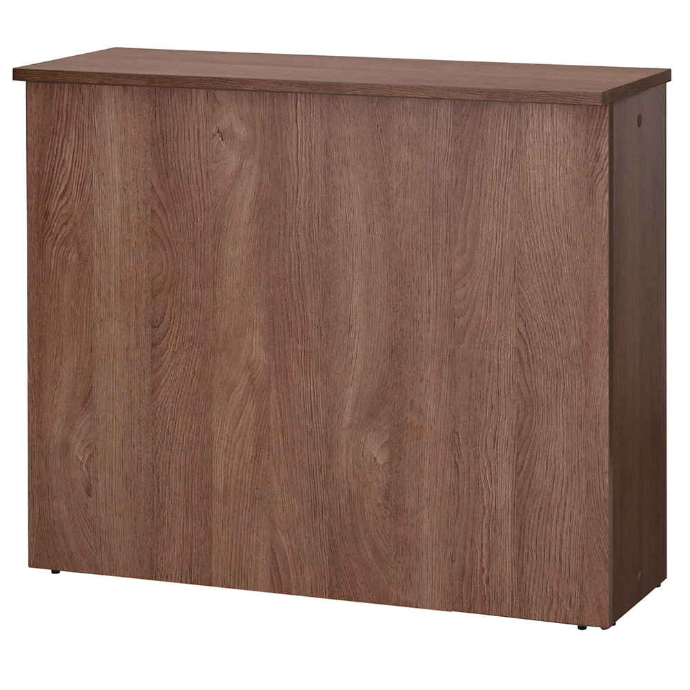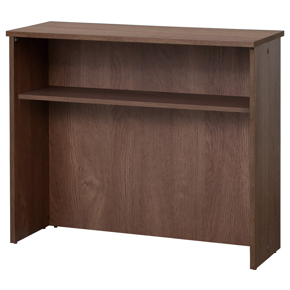 重くなり過ぎず落ち着いた雰囲気を醸し出す上品なウォルナットカラーの受付用ハイカウンター。天板表面にはキズのつきにくい低圧メラミンを使用しています。内側はオープンで別売りのW1200用棚板(RFHC-1200-OPTDM2)を4枚まで取り付けできます。アジャスター付き。Jシリーズハイカウンターコーナー用を組み合わせてL字レイアウトでもご利用いただけます。