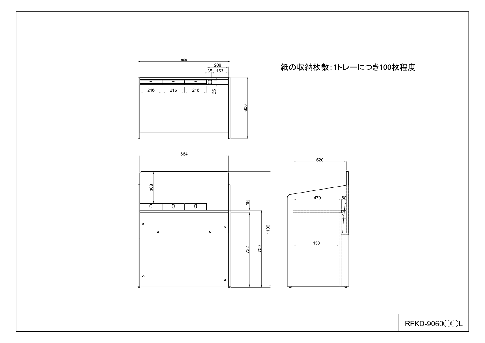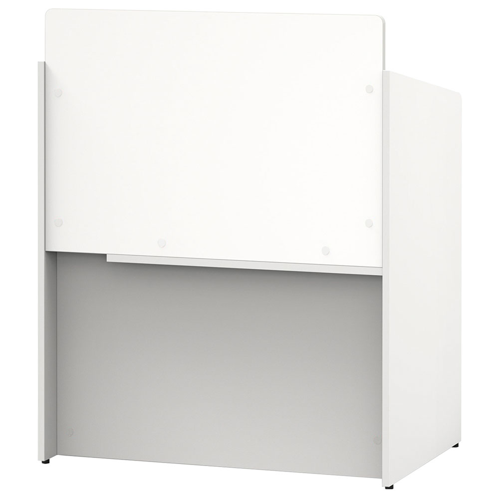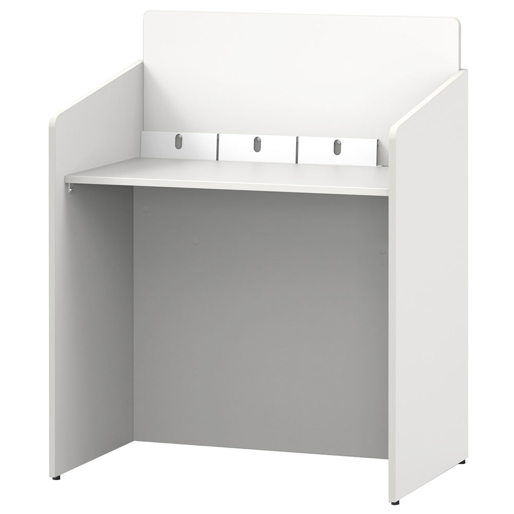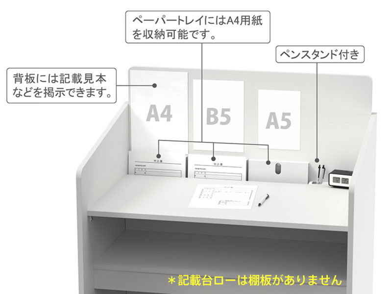 必要最低限の機能を取りそろえたシンプルなデザインの記載台。車いすの方も使いやすい天板高さ750mmのロータイプです。申込書・問診票などA4用紙を3列に収納できるペーパーホルダーとペンスタンドを装備、フロントパネルには記入見本等の掲示が可能です。サイドパネルの立ち上がりで記入時の手元が隠れさりげなくプライバシーを保護します。役所や銀行、病院や店舗など様々な施設でご利用いただけます。