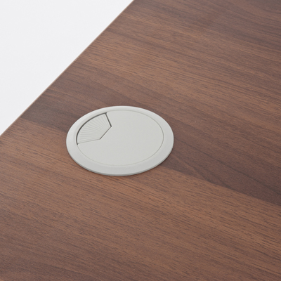 天板の両端に配線穴のついたJシリーズのOAローカウンター。幕板の左右にも切り欠きがあります。幕板は天板奥行きの中央に位置しています。別売のJシリーズのローカウンターW750、W1800及びコーナー用等を連結してL字レイアウトでもご使用いただけます。