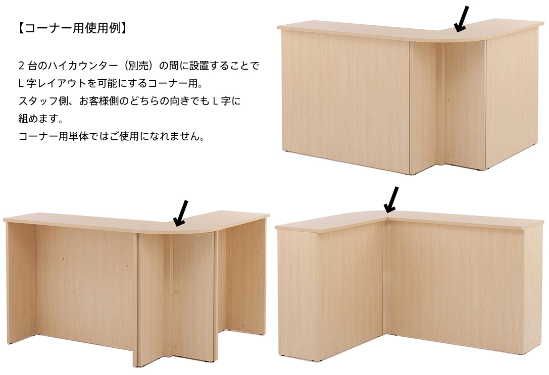 Jシリーズのハイカウンターコーナー用。Jシリーズのハイカウンターストレートタイプ2台と連結してL字レイアウトでご利用いただけます。カウンターの囲む向きは、お客様側、スタッフ側のどちらでも可能です。ストレートタイプとコーナー用はボルトでしっかり連結できます。
