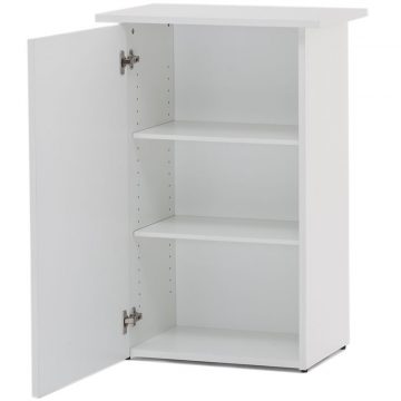 シンプルで機能的な無人受付用カウンター。天板下は扉付き収納で可動棚が2枚あり、32mmピッチでお好みの高さに設置してご利用いただけます。