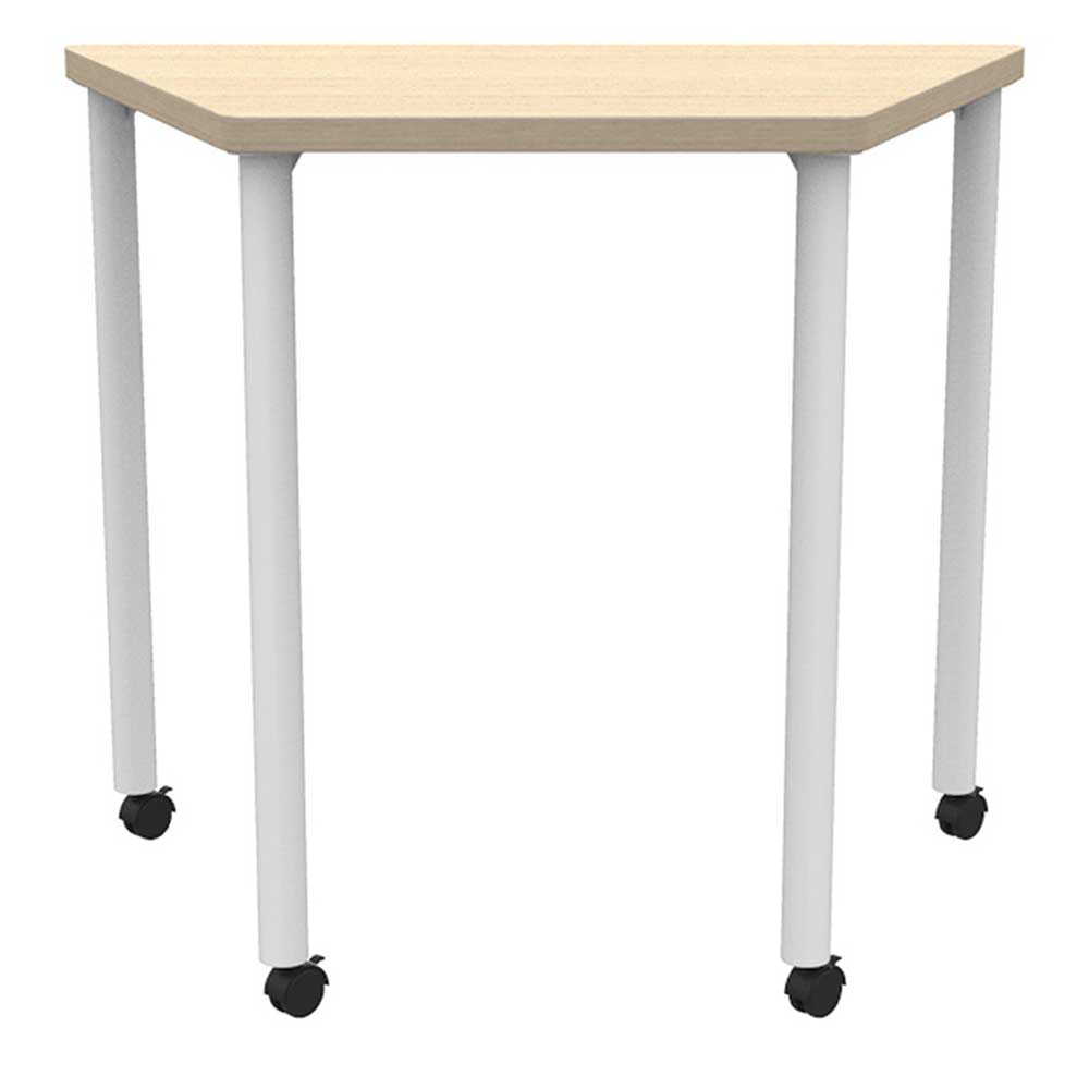 アクティブラーニングの学習スペースに適した研修用台形キャスターテーブル。1人用サイズの台形天板デスクはキャスター脚で移動が簡単、グループワークやディスカッション等目的に合わせた組み合わせレイアウトが可能です。キャスターはすべてストッパー付き。移動時以外はストッパーをロックしてご使用ください。