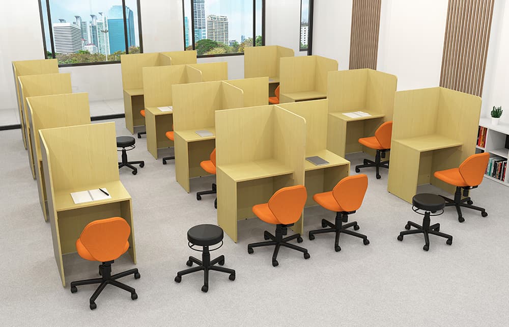 個別指導などに適したPASOシリーズのブースデスクT型。着席時に視界を遮る高さ1300mmのパネルが正面と中央でT字型につく2人席用デスクです。PASOシリーズのL型ブースデスク(RFBD-L)と組み合わせると、限られたスペースに効率よくレイアウトできます。中央の仕切りパネルはやさしい印象の丸角デザイン。