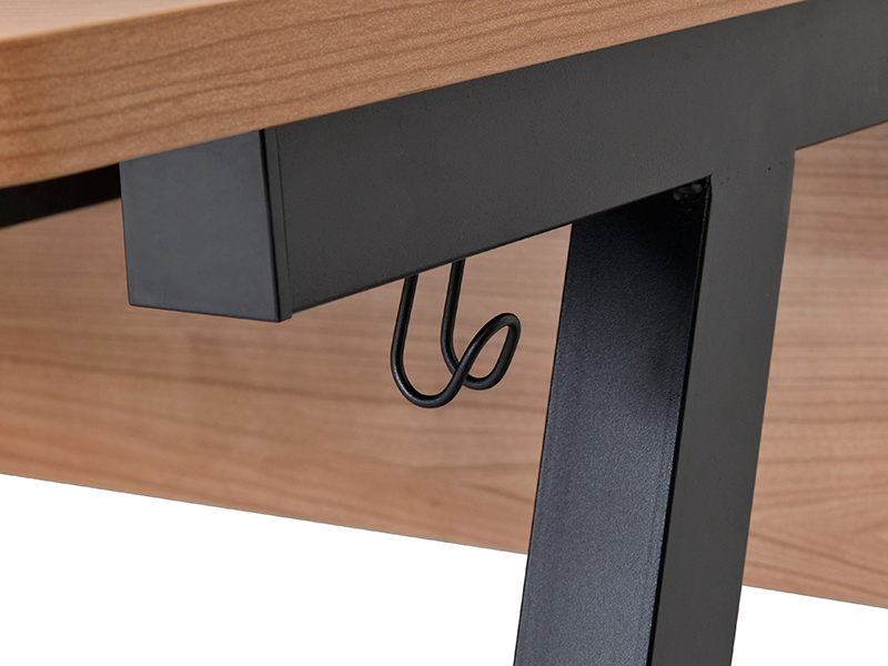 重厚感のある厚めの材を軽快なコンパスレッグでホームテイストのカジュアルなデザインに仕立てたI shaped(アイシェイプ)シリーズデスク。働き方改革、オフィスリニューアルのエントリーモデルとして導入しやすいコンパクトなデスクです。温もりを感じさせるウォルナットの天板は手前が丸角の優しい設計、スチール部分はブラック塗装でインダストリアルスタイルにもぴったり。天板には配線用切り欠きがあり、壁付けや対面レイアウトにも適しています。デスクサイドには荷物掛け用のフック(1個)が付属しています。