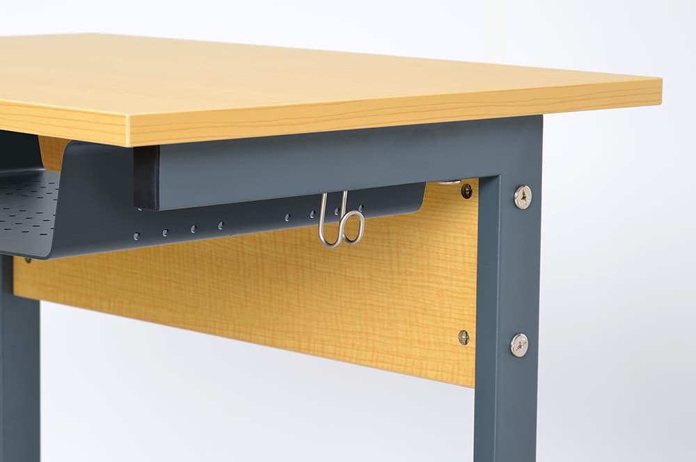天板幅600mm奥行450mmのコンパクトなスモール研修用デスク。限られたスペースにたくさん置けます。天板下には教材などを収納できるラックがあり、サイドにはバッグ等の手荷物が掛けられるフックが1個ついています。(左右付け替え可能)