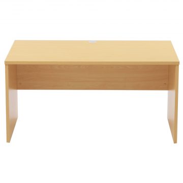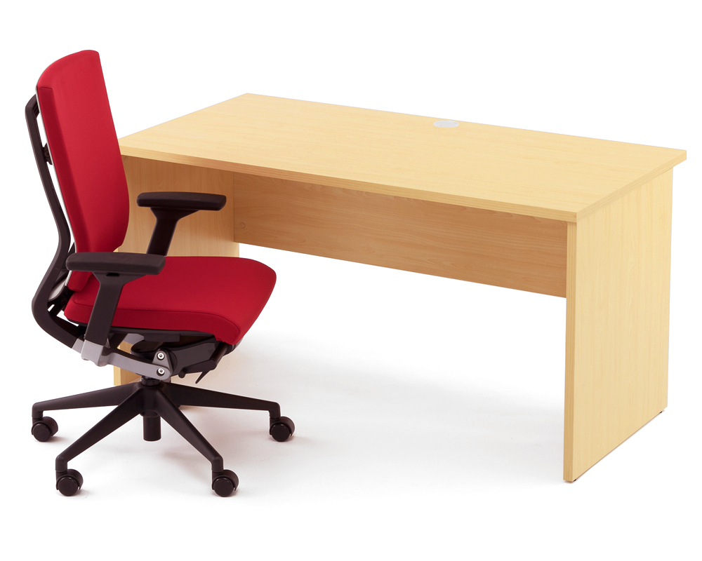 Jシリーズの木製デスクW1400xD700ナチュラル。天板中央に配線穴、幕板に切り欠きがあり、壁付けや対面レイアウトに対応。天板奥行き700のデスクはモニターの設置にも適しています。