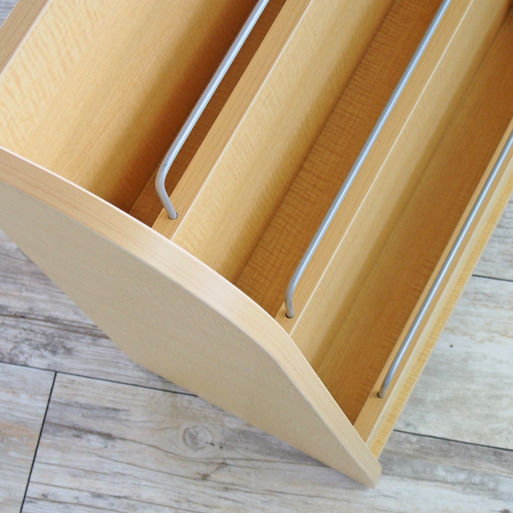 小さなお子様でも手の届くロータイプの木製マガジンラック。1段にA4サイズが2列で収納できます。背面化粧あり。
