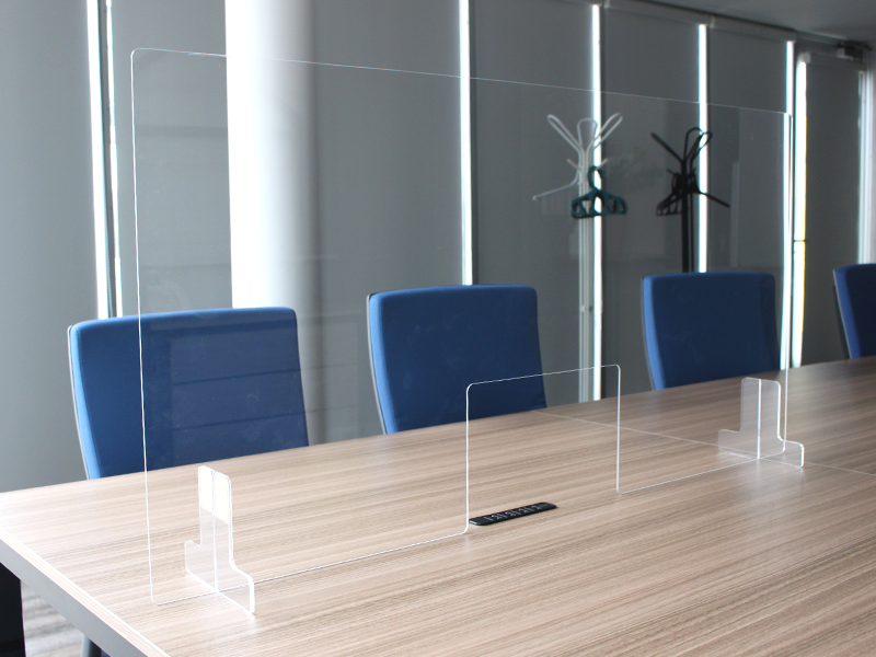 机上での飛沫感染を防ぐ透明アクリルパーテーション。接客対応中の書類や釣り銭の受け渡しが可能な窓付きタイプ。脚部落下防止機構により組み立て後でも台座をつけたまま移動や持ち運びが可能です。窓付きパネルは配線機能やコンセントのあるフリーアドレスデスクやミーティングテーブルでの飛沫予防にもご利用いただけます。