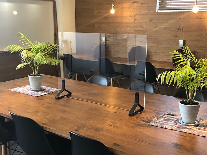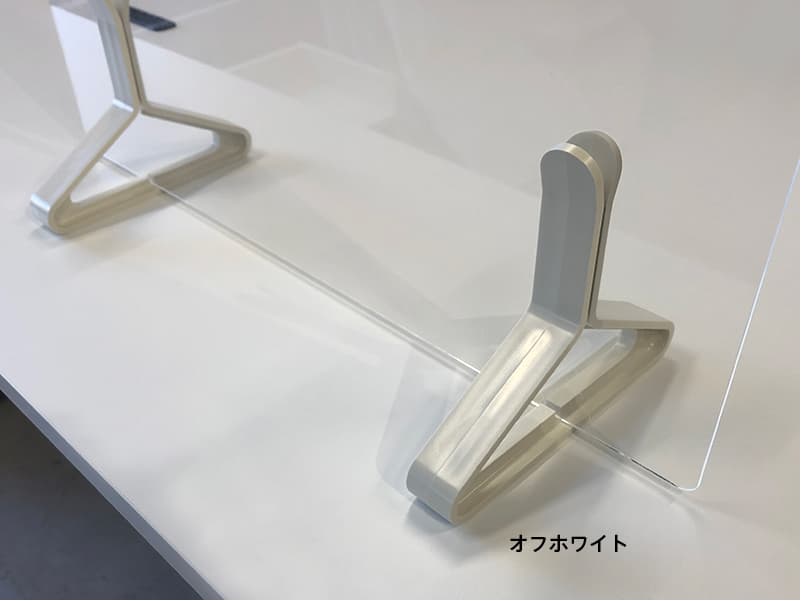 空間のアクセントになるカラー脚が特徴の卓上用飛沫防止パネルPINZOシリーズ。