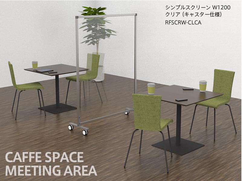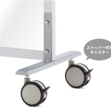 視界を遮らずに飛沫防止ができる自立型の透明アクリルスクリーンワイドW1200キャスター仕様。パネル面が無色透明のクリアで圧迫感がなく、インテリア性を損ないません。キャスター脚で移動も簡単、必要な時に必要な場所でご利用いただけます。オフィスや店舗等で人が密集しがちなエリアの飛沫予防に最適です。