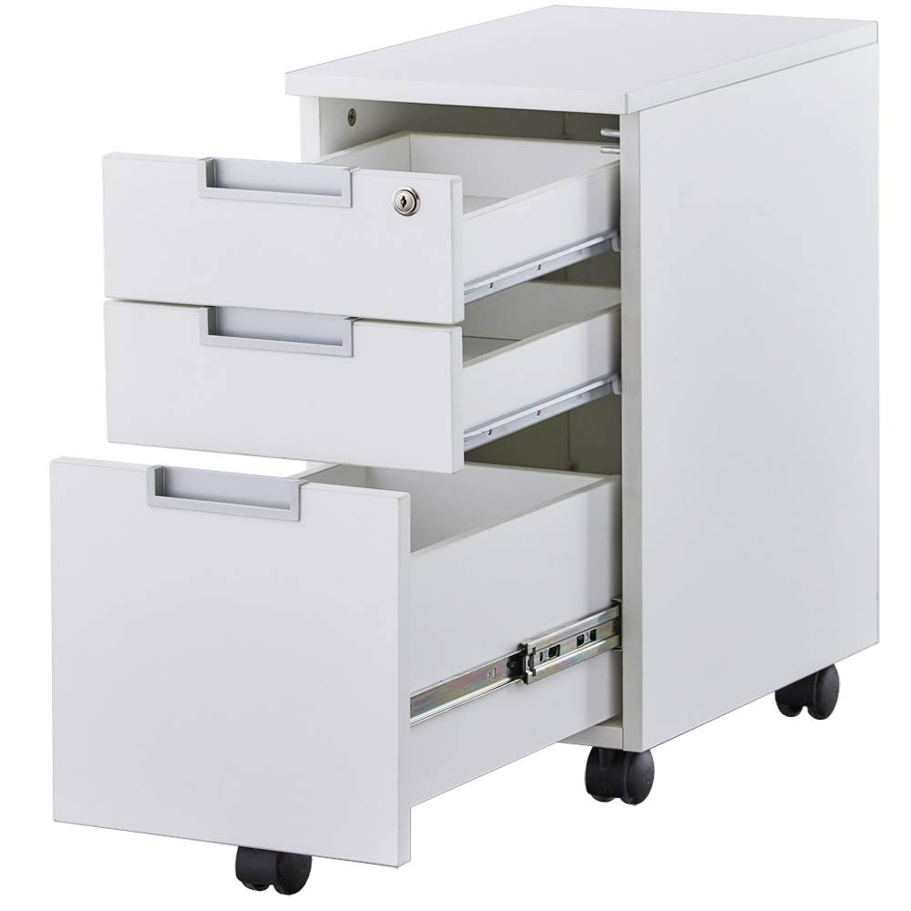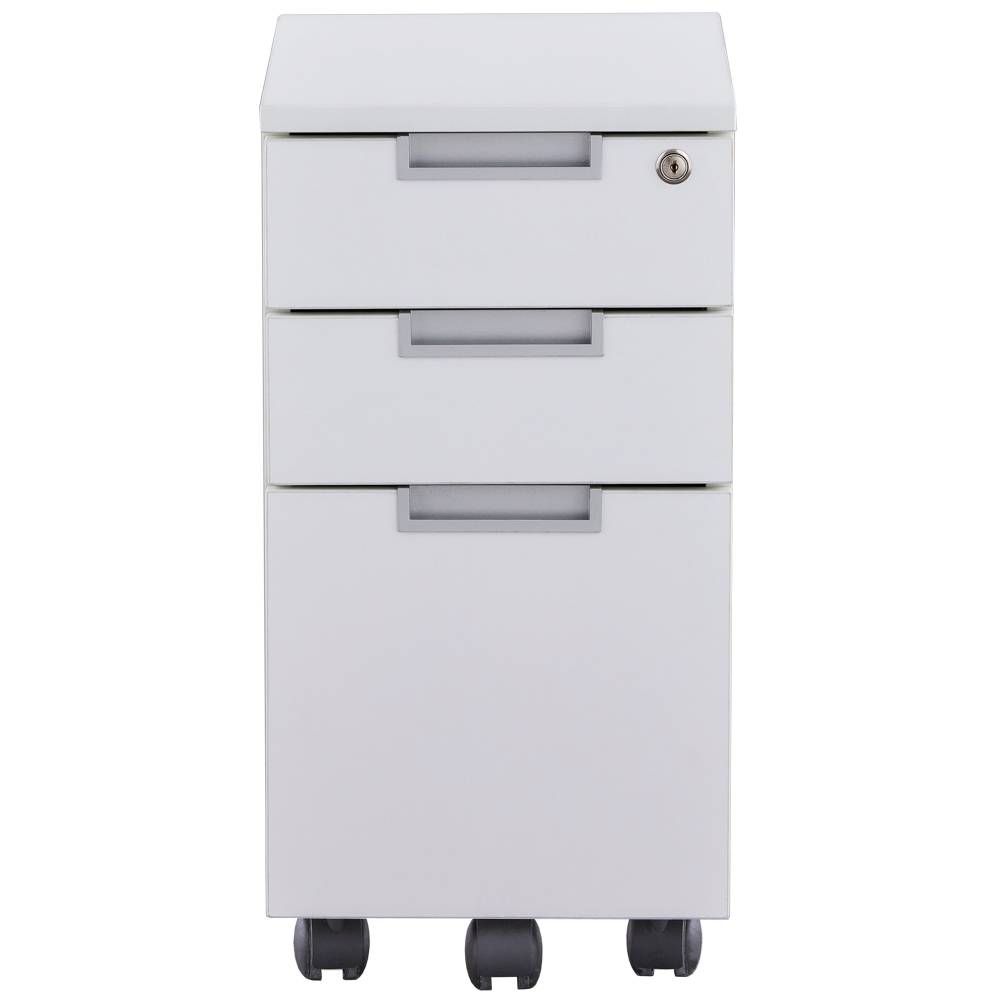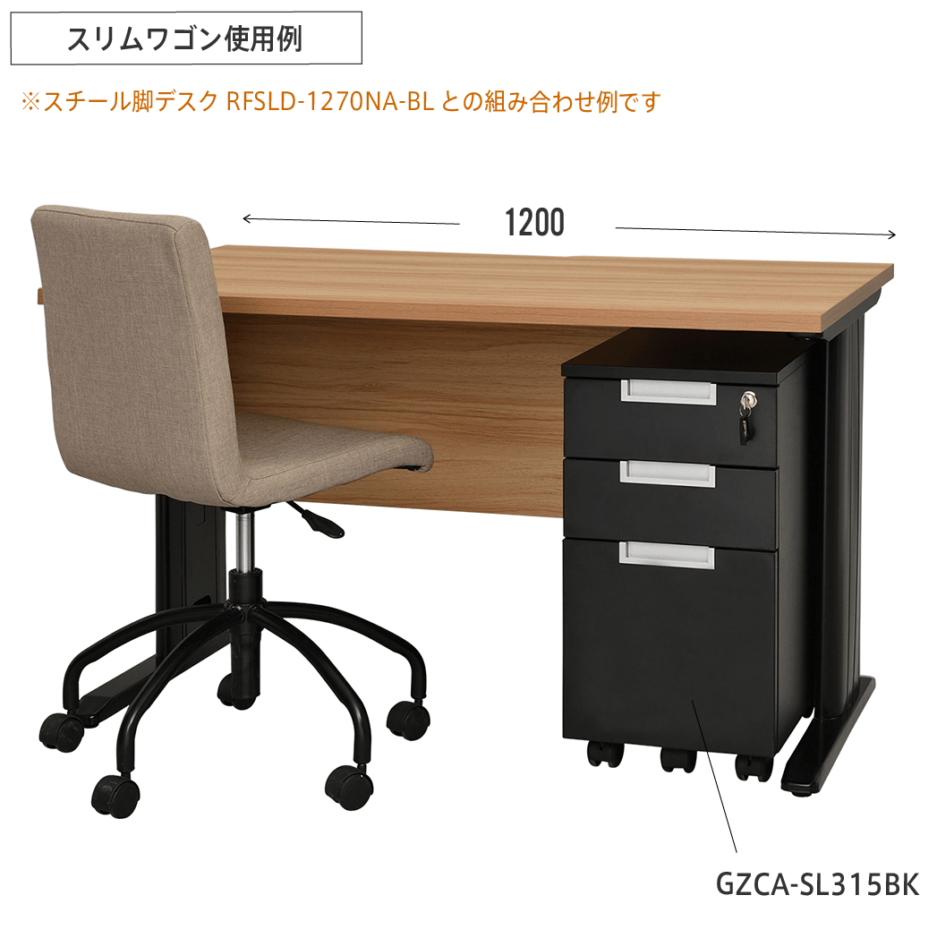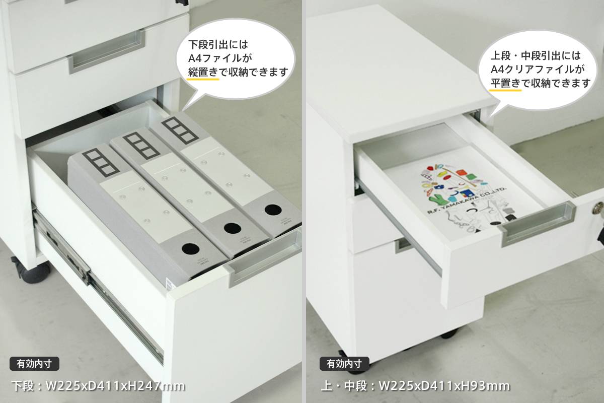アソートシリーズ及びリスムシリーズのデスクと合わせてご利用いただける奥行き490mmの3段スリムワゴン。幅1000mmのデスク下に置いてもちょうど良いサイズ感で足元が窮屈になりません。コンパクトながら収納力もあり、引出しの上段・中段にはA4クリアファイルが平置きに、下段にはA4ファイルの縦置きが可能です。引出しは下段のみフルオープン可、上・中段は1/3ほど残して引き出せなくなる仕様です。キャスターの内2個はストッパー付き。移動時以外はロックしてご使用ください。