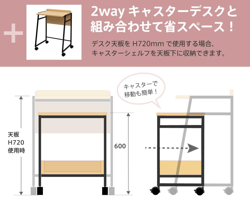 デスク脇に置いて簡易作業台やサイドテーブル、荷物置きとして活躍するLil(リル)シリーズのキャスターシェルフ。2wayキャスターデスクをH720mmで使用する場合、天板下に収納が可能な省スペース設計。在宅での快適なデスクワークをサポートする機能的なデスクサイドワゴンです。